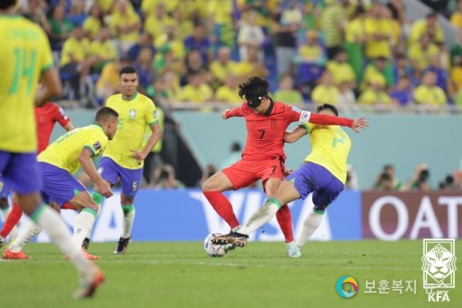하지만 한국은 뭔가 해보기도 전에 전반에만 네 골을 내주며 끌려갔다. 전반 7분 비니시우스가 하피냐의 땅볼 크로스를 받아 문전에서 오른발 슛을 시도해 골망을 갈랐다. 6분 후인 전반 13분에는 히샬리송이 얻어낸 페널티킥을 네이마르가 침착하게 성공시키며 한 발짝 더 달아났다.