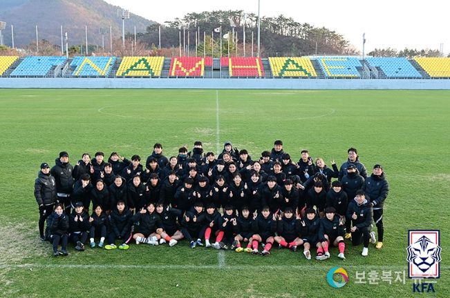 김은정 감독이 이끄는 여자 U-15 대표팀은 7일 남해스포츠파크에서 열린 여자 U-16 대표팀과의 연습경기에서 3-1로 승리했다. 두 팀은 치열하게 연습경기를 펼친 뒤 단체 기념촬영을 함께 하며 우애를 다지기도 했다.