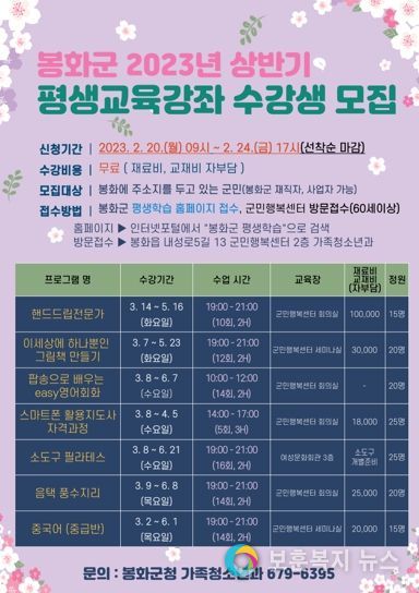 보훈복지뉴스 유서진 기자 | 봉화군은 20일부터 24일까지 2023년 상반기 평생교육정규과정 수강생을 선착순으로 모집한다.
