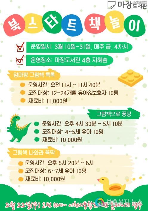 보훈복지뉴스 유서진 기자 | 이천시립마장도서관은 ‘책과 함께 인생을 시작하자’는 북스타트 운동의 일환인 ‘2023년 북스타트 책놀이 프로그램’을 오는 3월 한 달동안 운영한다.
