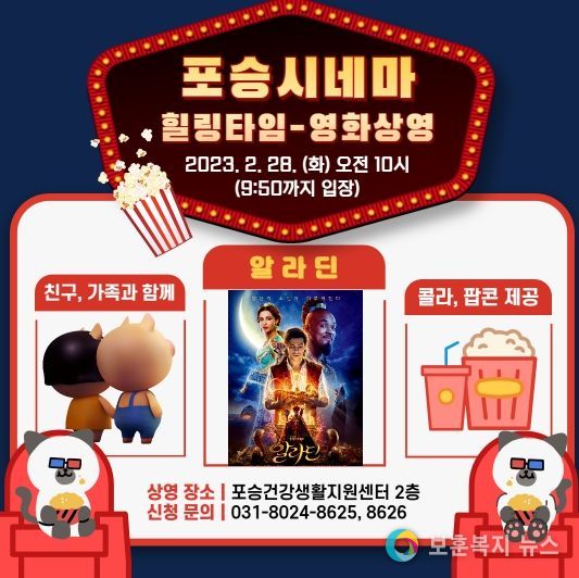 포승시네마는 친숙한 매체인 영화를 통해서 정서적 치료와 소통의 장 마련을 위한 프로그램으로, 첫 영화 상영은 겨울방학 어린이를 대상으로 오는 28일 화요일 오전 10시에 ‘알라딘’을 상영한다. 다만 센터 사정에 따라 영화가 변경될 수도 있다.
