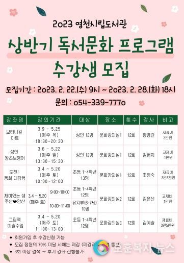 보훈복지뉴스 유서진 기자 | 영천시는 3월 4일부터 5월 25일까지 영천시립도서관에서 지역주민들을 대상으로 ‘2023년 상반기 독서문화 프로그램’을 운영한다.