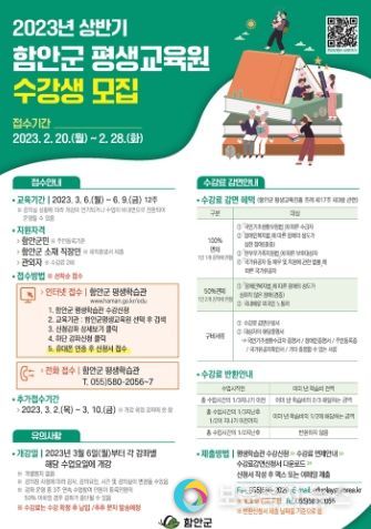 보훈복지뉴스 유서진 기자 | 함안군은 2023년 상반기 평생교육원 정규강좌 수강생을 오는 20일(월)부터 28일(화)까지 선착순으로 모집한다고 밝혔다.