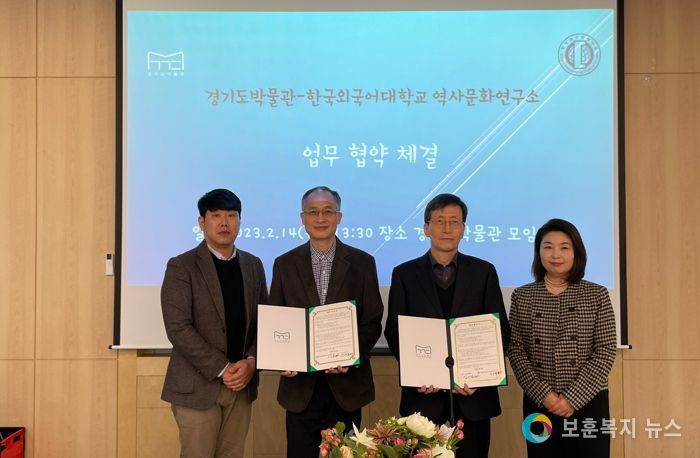 보훈복지뉴스 유서진 기자 | 경기문화재단 경기도박물관(관장 김기섭)과 한국외국어대학교 역사문화연구소는 2월 14일 오후 경기도박물관 소회의실에서 ‘경기도박물관-한국외국어대학교 역사문화 지식 공유 및 대중성 강화’를 위하여 상호협력 업무협약(MOU)을 체결했다.