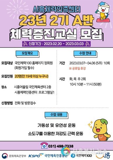 보훈복지뉴스 유서진 기자 | 시흥시가 운영하는 국민체력100 시흥체력인증센터에서 '2023년 체력증진교실 2기' 회원 20명을 모집한다.