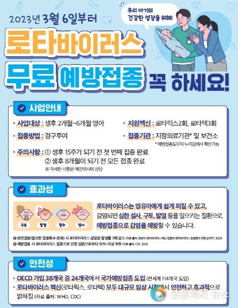 보훈복지뉴스 유서진 기자 | 파주보건소는 3월 6일부터 생후 2~6개월 영유아를 대상으로 로타바이러스 무료 예방접종을 시행한다고 밝혔다.