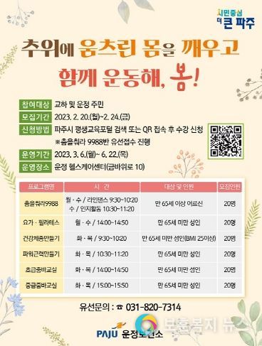 모집 대상자는 대면 운동을 희망하는 교하 및 운정 주민 120명으로 신청은 2월 20일부터 2월 24일까지 파주시 평생교육포털을 통해 수강 신청이 가능하고, 만 65세 이상 대상인 ‘춤을춰라 9988’반의 경우는 유선 접수로 신청 가능하다.