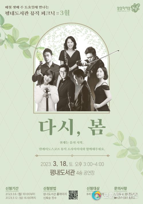 보훈복지뉴스 유서진 기자 | 남양주시 평내도서관은 오는 3월 18일 ‘다시, 봄’이라는 주제로 뮤직 피크닉 행사를 운영한다.