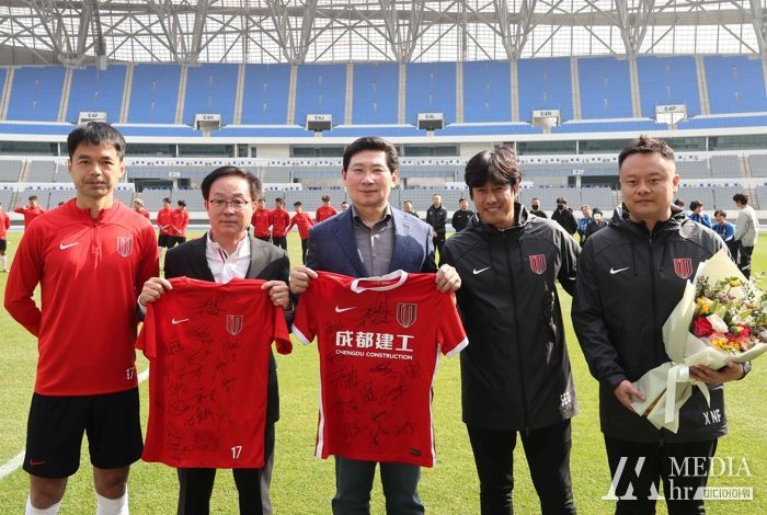 미디어아워 이호민 기자 | 이상일 용인특례시장이 전지훈련차 용인특례시 미르스타디움을 찾은 중국 청두 룽청FC 선수단을 맞이했다.