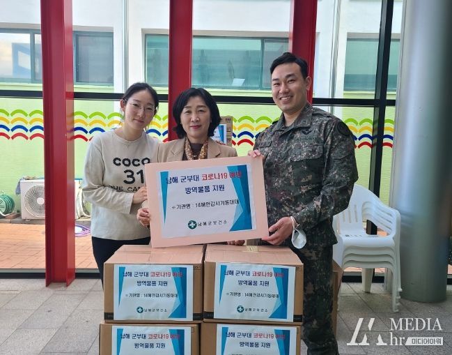 미디어아워 진금하 기자 | 남해군보건소는 15일 국방의 의무를 수행하는 군 장병들의 코로나19 예방을 위해 필수의약품 및 방역물품을 남해 14 해안감시 기동대대에 전달했다.
