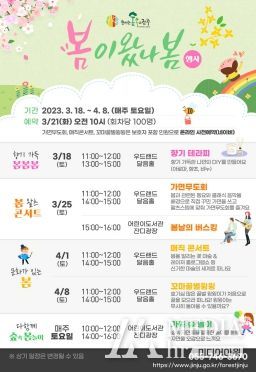 미디어아워 김성연 기자 | 진주시는 오는 18일부터 4월 8일까지 매주 토요일 봄맞이 문화행사 ‘숲속의 진주 봄이 왔나 봄’을 월아산 숲속의 진주 일원에서 운영한다.