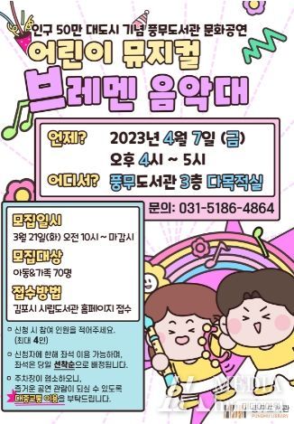 미디어아워 박미영 기자 | 김포시 풍무도서관은 김포시의 인구 50만 대도시 지정을 기념, 문화공연으로 ‘어린이 뮤지컬 브레멘 음악대’를 운영한다.