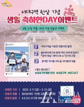 먼저 서대구역 한 살 기념“생일 축하한DAY”이벤트를 개최한다. 참여기간은 3월 17일부터 31일까지이며, 서대구역 방문 또는 이용 인증사진을 필수해시태그와 함께 개인 SNS에 업로드 한 뒤 응모페이지에 참여인증을 하면 된다. 당첨자 100명에게는 4월 5일에 파리바게뜨 1만원 교환권을 지급한다. 이벤트와 관련된 자세한 사항은 서구청 공식블로그를 확인하면 된다.