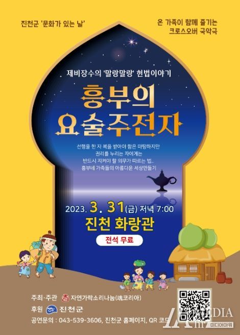 미디어아워 진금하 기자 | 진천군은 오는 31일 오후 7시 화랑관에서 3월 문화가 있는 날 기획공연으로 국악극 ‘흥부의 요술주전자’를 공연한다고 17일 밝혔다.