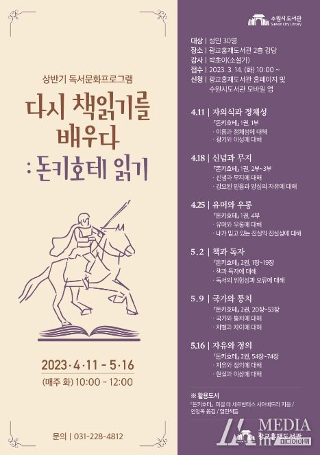 미디어아워 진금하 기자 | 수원시 광교홍재도서관은 '돈키호테' 배경과 숨겨진 의미를 찾아보고 이해할 수 있는 강의 ‘다시 책 읽기를 배우다 : 돈키호테 읽기’의 수강생을 모집한다.