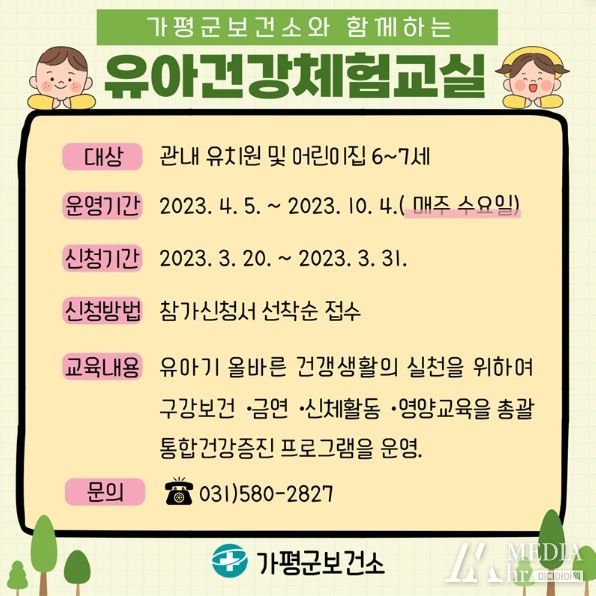 미디어아워 진금하 기자 | 가평군 보건소는 관내 아동을 대상으로 4월1일부터 10월4일까지 매주 수요일 가평군보건소 건강증진센터에서 '유아 건강 체험교실'을 운영한다.