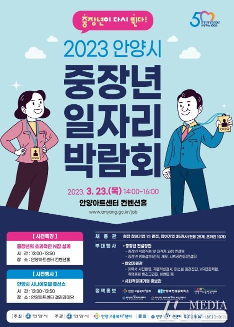 미디어아워 진금하 기자 | 안양시가 중장년층의 고용을 촉진하기 위한 박람회 ‘중장년이 다시 뛴다!’를 오는 23일 오후 2~4시 안양아트센터 컨벤션홀에서 개최한다고 17일 밝혔다.