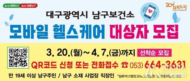 미디어아워 김성연 기자 | 대구광역시 남구청은 남구보건소에서 3월 20일부터 4월 7일까지 2023년 모바일 헬스케어 사업 대상자 220명을 선착순 모집한다고 17일 밝혔다.