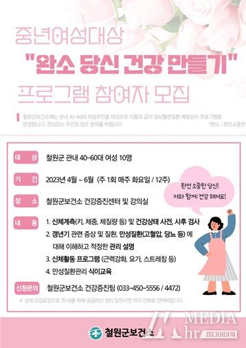 미디어아워 박미영 기자 | 철원군보건소는 40~60대 중년여성을 대상으로‘완소(완전소중한) 당신 건강만들기’참여자 10명을 오는 3월 말까지 선착순으로 모집한다.