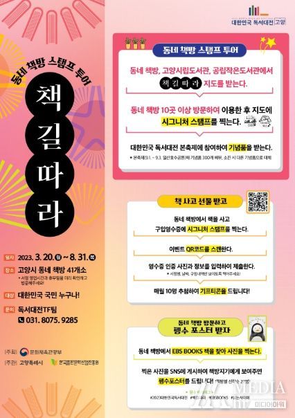 미디어아워 진금하 기자 | 고양특례시는‘2023 대한민국 독서대전’개최를 기념하여 책의 도시 챌린지 연중 프로그램을 다양하게 전개하고 있다. 이번에는 지역서점 이용을 활성화하고 책 읽는 문화 확산을 위해 동네책방 스탬프 투어 ‘책길따라’를 오는 3월 20일부터 8월 31일까지 운영한다.