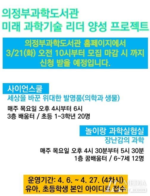미디어아워 진금하 기자 | 의정부시 과학도서관은 ‘미래 과학기술 리더 양성 프로젝트(4월)’로 초등 1~3학년을 대상으로 한 '사이언스쿨'과 6·7세 유아를 대상으로 한 '놀이랑 과학 실험실'을 운영한다.