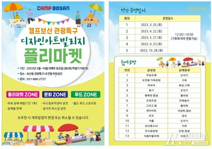 이번 플리마켓은 디자인아트빌리지 공방제품 판매, 두드림뮤직센터 상설공연 및 길거리 버스킹 공연, 월드푸드 스트리트 등 방문객에게 다양한 볼거리와 먹거리를 제공할 예정이다. 또한 유·무료 공예체험 및 캠프보산의 다양한 행사 이벤트도 함께 진행된다.