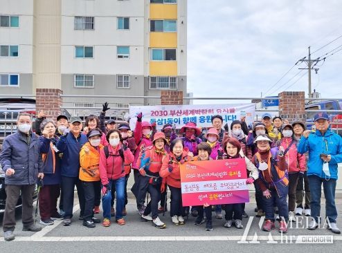 미디어아워 김성연 기자 | 영도구 동삼1동 해오름워킹클럽에서 지난 3월 18일 국제박람회 기구 실사단 방한을 앞두고 회원 30여명이 참석한 가운데 '2030 부산세계박람회' 유치를 기원하는 봉래산 둘레길 걷기행사를 개최했다.