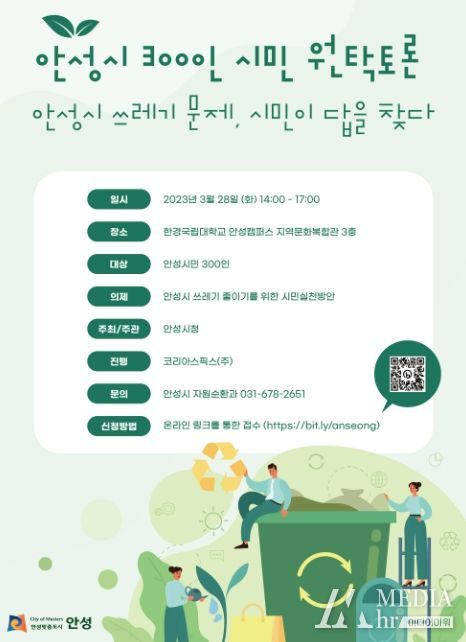 미디어아워 진금하 기자 | 안성시가 오는 28일 오후 2시부터 5시까지 한경국립대학교 지역문화복합관 3층 체육관에서 쓰레기 문제 해소를 위한 “안성시민 300인 원탁토론회”를 개최한다.