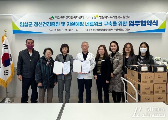 미디어아워 이호민 기자 | 임실군 정신건강복지센터가 지난 21일 보건의료원에서 LH 임실이도주거행복지원센터와 입주민 대상 정신건강 증진 및 자살예방 지원체계를 구축하기 위한 업무협약을 체결했다.