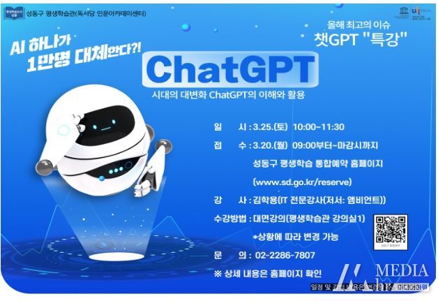 미디어아워 진금하 기자 | 서울 성동구가 최근 주목을 받는 대화형 인공지능 ‘챗 GPT’ 특강을 오는 25일 오전 10시에 금호동 독서당 인문아카데미 센터에서 진행한다.