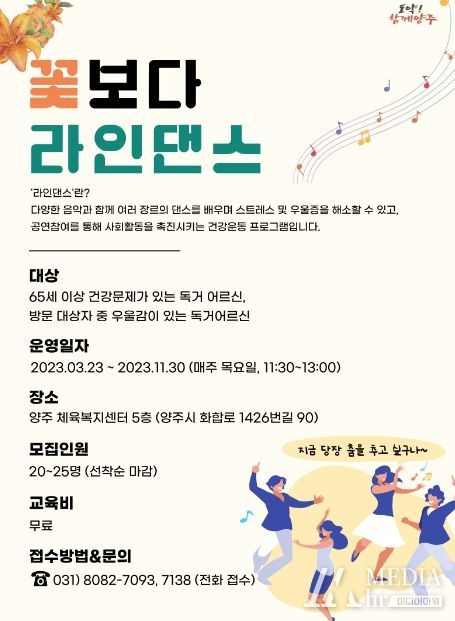 미디어아워 진금하 기자 | 양주시보건소는 오는 23일부터 관내 독거 어르신을 대상으로 ‘꽃보다 라인댄스’ 프로그램을 운영한다.