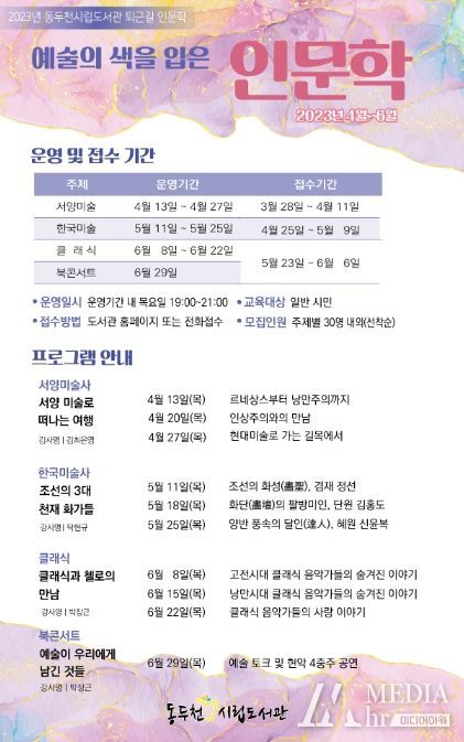 미디어아워 진금하 기자 | 동두천시 평생교육원 시립도서관에서는 오는 4월 13일부터 6월 29일까지 일반 시민을 대상으로 ‘예술의 색을 입은 인문학’ 프로그램을 운영한다고 밝혔다