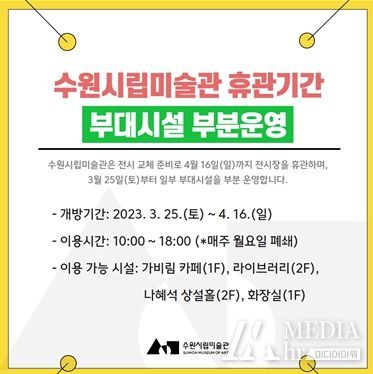 미디어아워 최지은 기자 | 경기도 수원시 수원시립미술관은 전시 교체 준비로 3월 25일부터 4월 16일까지 전시장을 휴관하고 부대시설만 부분 운영한다.