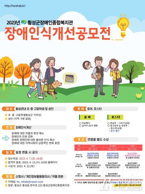 장애인식개선 공모전은 표어와 포스터를 제작하여 참여할 수 있고, 초·중·고등학생 중 최우수작품에는 횡성교육지원청장 상장 및 상품권을, 성인 중 최우수작품에는 횡성군장애인종합복지관 관장상 및 상품권을 수여한다.