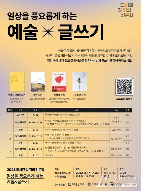 미디어아워 진금하 기자 | 파주시 중앙도서관은 올해도 ‘도서관 길 위의 인문학’ 사업 공모에 선정돼 4월 13일부터 ‘일상을 풍요롭게 하는 예술과 글쓰기’라는 주제로 프로그램이 운영된다고 밝혔다.