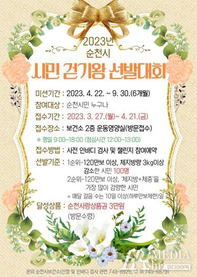 미디어아워 이호민 기자 | 순천시는 지역사회 건강 지표인 걷기 실천율, 신체활동 증가율 향상을 위해 2023 시민 걷기왕 선발대회를 개최하며 걷기왕에 도전할 순천시민을 다음 달 21일까지 모집한다고 밝혔다.
