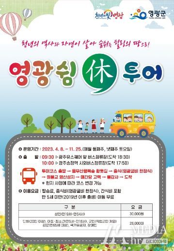 미디어아워 최지은 기자 | 영광군의 역사·문화·자연 명소와 함께하는 힐링여행인 영광 쉼休,투어가 4월8일부터 운행을 시작한다. 민선 8기 역점시책인 영광 쉼休,투어는 2022~2023 전라남도 방문의 해를 맞아 관광객들에게 여행 편의를 제공하고 영광의 숨은 매력을 알려 관광객 유치 효과를 극대화하고자 올해부터 새롭게 추진했다.