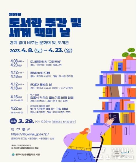 미디어아워 진금하 기자 | 중천철학도서관은 오는 4월 8일부터 23일까지 제59회 도서관 주간 및 세계 책의 날을 기념하여 ‘경계 없이 비추는 문화의 빛, 도서관’이라는 주제로 원주시민을 위한 행사를 운영한다.