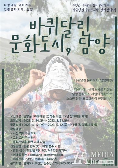 미디어아워 이호민 기자 | 담양군문화재단이 오는 3월 31일까지 담양 문화도시의 찾아가는 현장형 프로젝트 ‘바퀴달린 문화도시, 담양’ 참여 마을을 모집한다.