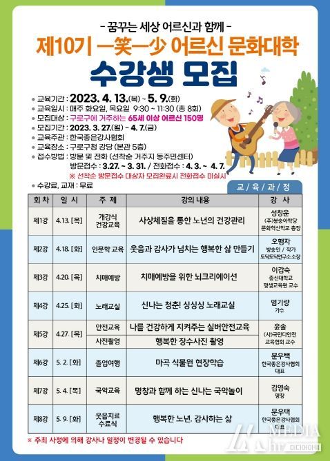구로구가 어르신들의 지식습득과 활기찬 생활을 위해 관내 만 65세 이상 어르신을 대상으로 ‘일소일소 어르신 문화대학’을 운영한다.