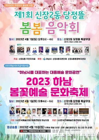 미디어아워 박미영 기자 | 오는 4월 1일 토요일 오후 2시~6시까지 하남시 특설무대(경기도 하남시 신장동 244)에서 (사)한국연예예술인총연합회 하남지회의 ‘2023년 하남 봄꽃예술 문화축제’와 신장2동 주민자치회의 ‘제1회 당정뜰 봄봄음악회’가 함께 진행된다.