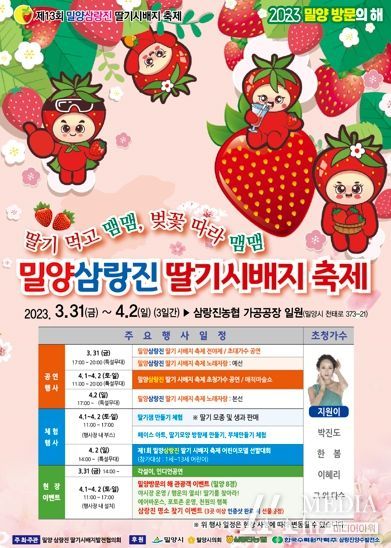 미디어아워 이호민 기자 | 제13회 밀양삼랑진 딸기시배지 축제가 오는 3월 31일 전야제를 시작으로 4월 2일까지 3일간 삼랑진농협 가공공장에서 열린다.