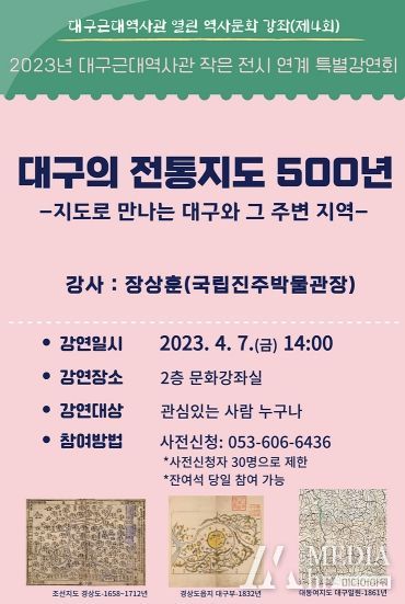 미디어아워 최지은 기자 | (재)대구문화예술진흥원 박물관운영본부 소속 대구근대역사관에서는 4월 7일 오후 2시에 ‘대구의 전통지도 500년 -지도로 만나는 대구와 그 주변 지역-’이란 주제로 특별강연회를 개최한다.