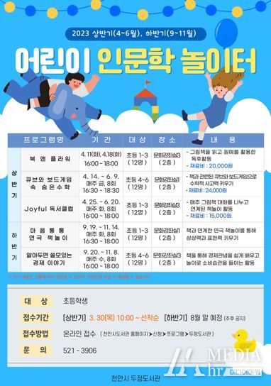 미디어아워 이호민 기자 | 천안시 두정도서관이 오는 4월부터 초등학생을 대상으로 ‘어린이 인문학 놀이터’ 프로그램을 운영한다.