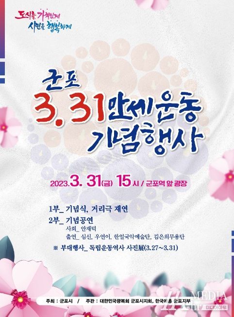 미디어아워 진금하 기자 | ‘도시를 가치있게, 시민을 행복하게’를 구현 중인 군포시가 오는 31일 오후 3시부터 군포역 앞 항일독립만세운동 기념탑 일대에서 104주년 ‘군포 3.31 만세운동 기념행사’를 개최한다고 밝혔다.