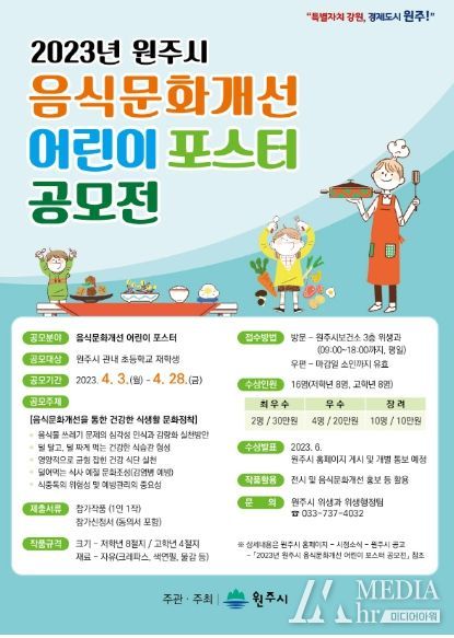 미디어아워 진금하 기자 | 원주시보건소는 건강하고 올바른 음식문화 정착을 위해 ‘2023년 원주시 음식문화개선 포스터 공모전’을 개최한다.