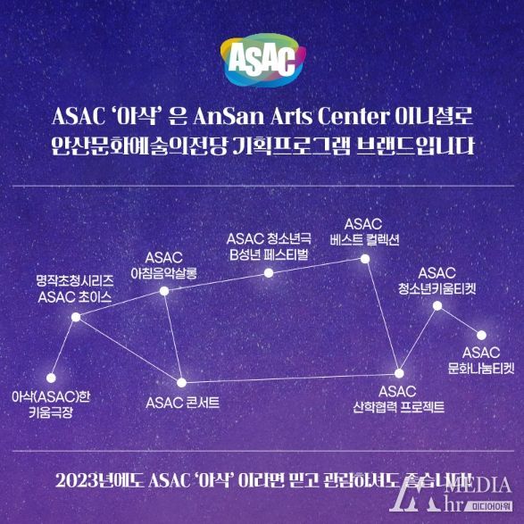 안산문화예술의전당 공연기획부는 “무수히 많은 별 중에서 일부의 별에 의미를 담아 선으로 연결하여 하나의 고유한 별자리를 이루듯이 ASAC은 안산문화재단과 안산문화예술의전당의 비전과 미션을 구체화하고 다양한 연결과 연결 속에서 지역 문화예술 활성화의 가치를 찾기 위한 고유한 브랜드가 되고자 한다. 공연예술 생태계와 시민의 문화예술 향유, 장르와 지역의 경계를 잇고 넘는 가교로서 안산문화예술의전당의 브랜드 가치를 실현하고 높이는 노력을 이 모든 프로그램 속에 담고, 스스로 변화하며 동시대적 지역 문화예술 과제를 포착하고 해결하는 노력을 지속함으로써 시민과 함께하는 시간을 만들 것이다.”라며 포부를 밝혔다.