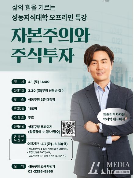 정원오 성동구청장은 “이번 강연이 자본주의와 주식투자에 대한 전반적인 이해를 높일 수 있는 좋은 기회가 될 것으로 기대한다.”며 “경제 환경이 불안정한 시기에 자산관리에 대한 관심이 높아지고 있는 만큼 이번 강연을 통해 많은 분들이 도움을 받으시길 바란다.”고 말했다.