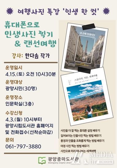 미디어아워 이호민 기자 | 광양시 중마도서관은 오는 4월 15일 토요일 오전 10시 30분, 중마도서관 인문학실에서 2023 중마도서관 여행 사진 특강 ‘인생 한 컷’을 진행한다고 밝혔다.