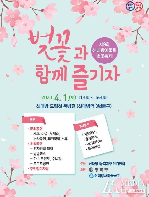 미디어아워 진금하 기자 | 동작구가 4월 1일 신대방 도림천 뚝방길(신대방역 3번 출구 앞)에서 ‘신대방 어울림 벚꽃축제’를 개최한다고 밝혔다.